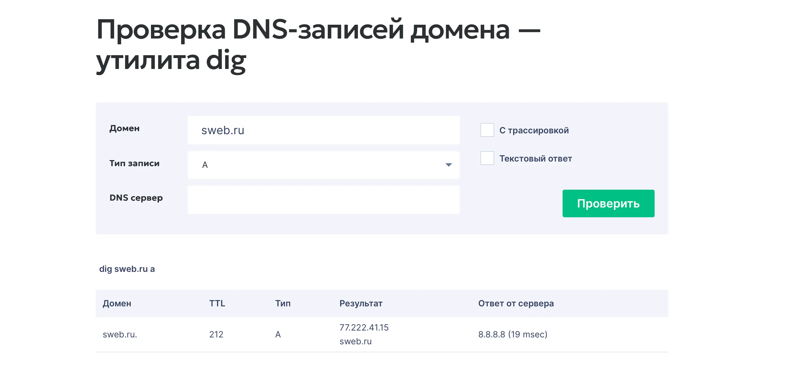 Для этого в поле «Домен» укажите имя вашего домена, в выпадающем списке выберите нужный тип записи и нажмите Проверить – сервис покажет текущие данные из DNS.
