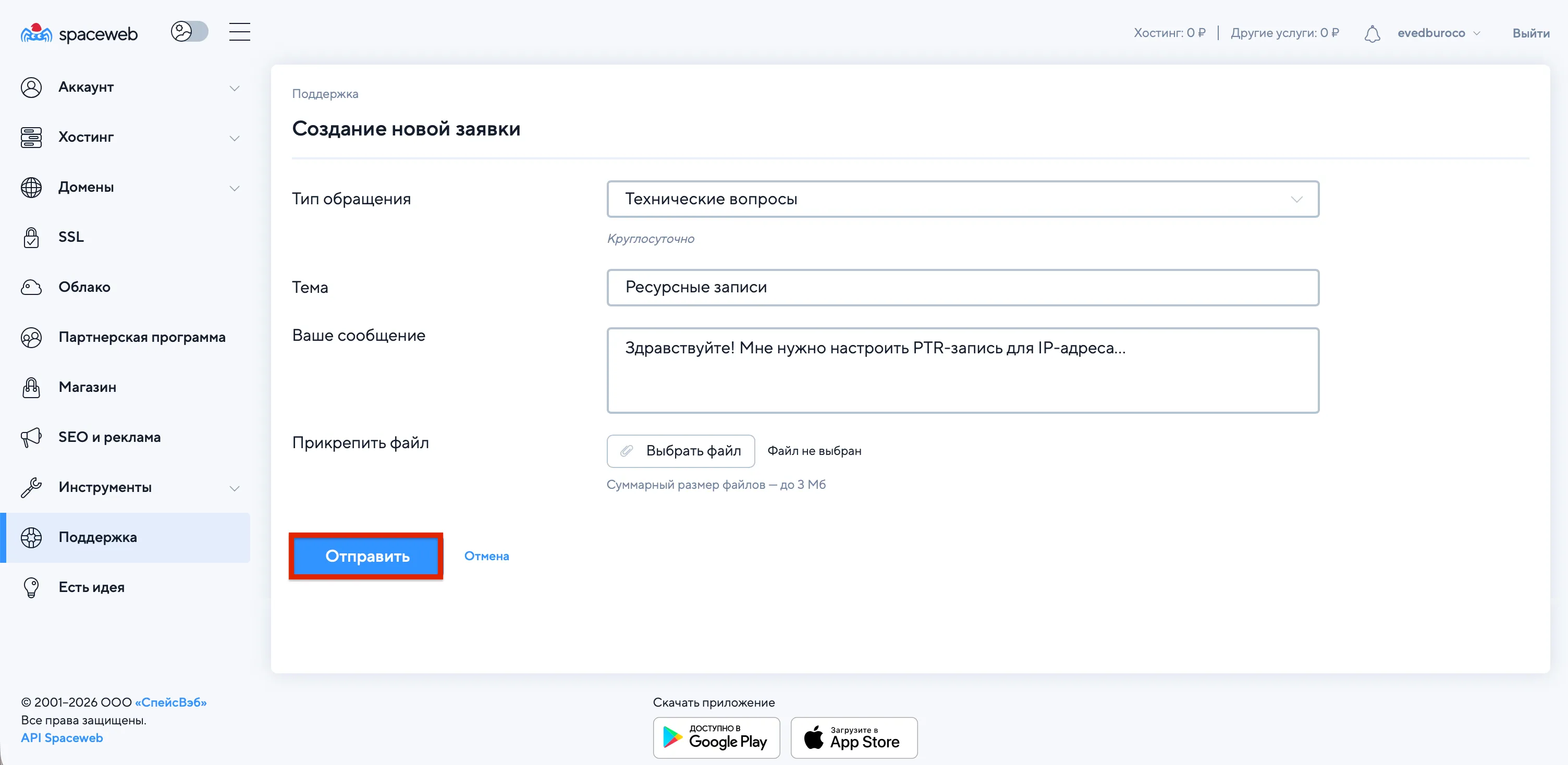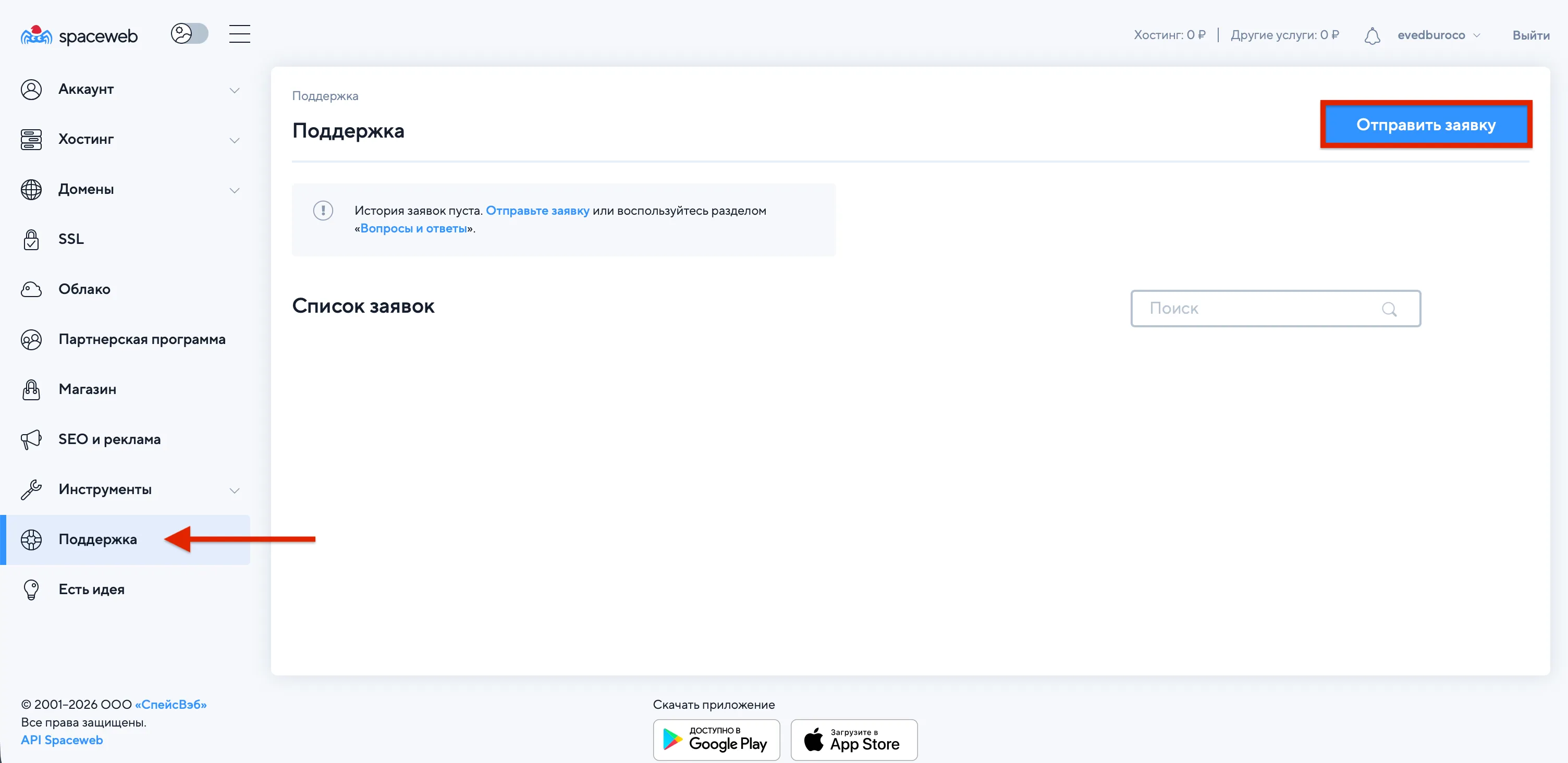 Чтобы отправить запрос в службу поддержки, откройте панель управления SpaceWeb и перейдите в раздел «Поддержка».