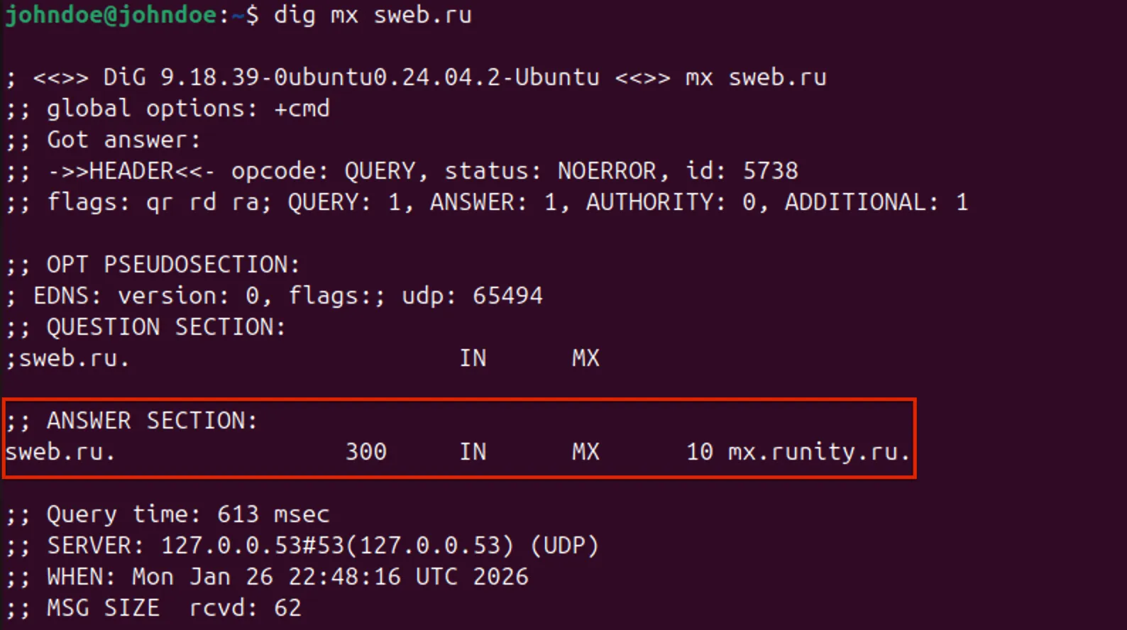 MX (Mail Exchange) – это DNS-запись, которая указывает, какие почтовые серверы принимают входящую почту для домена. Когда письмо отправляется на адрес вида user@domain.ru, отправляющий почтовый сервер сначала запрашивает MX-записи домена, чтобы понять, куда именно доставлять сообщение.