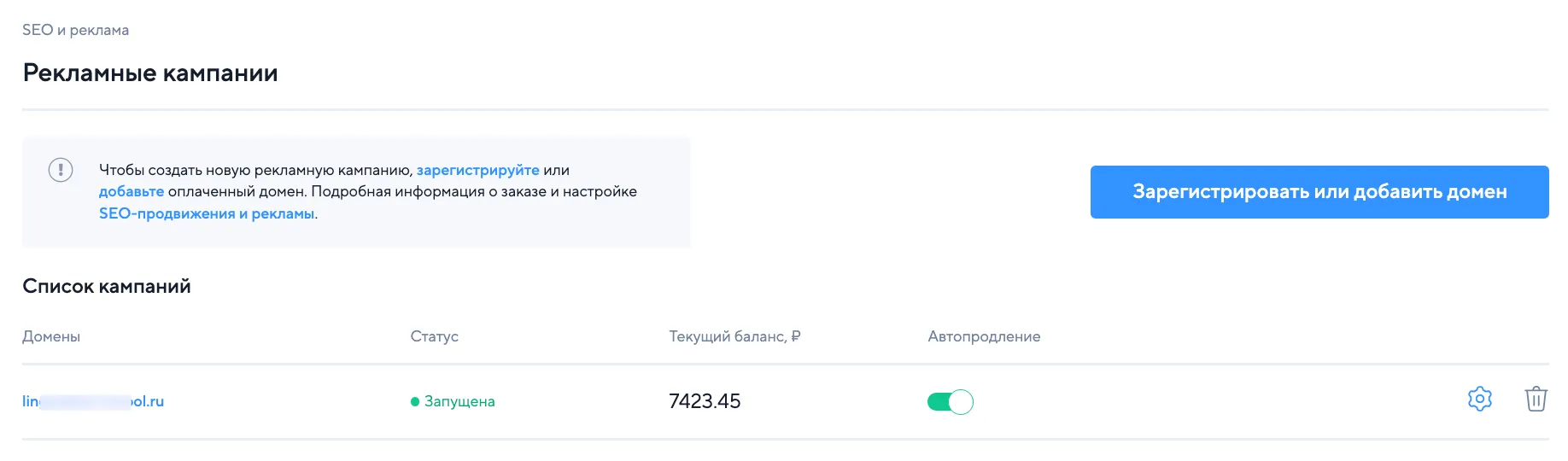 - Выберите в списке нужный домен и нажмите Создать кампанию.