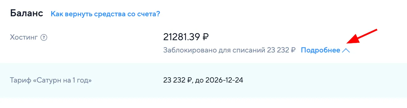- Заблокированные денежные средства по текущему тарифу на год не могут быть использованы на иные услуги (регистрация/продление доменных имен и дополнительные услуги).
