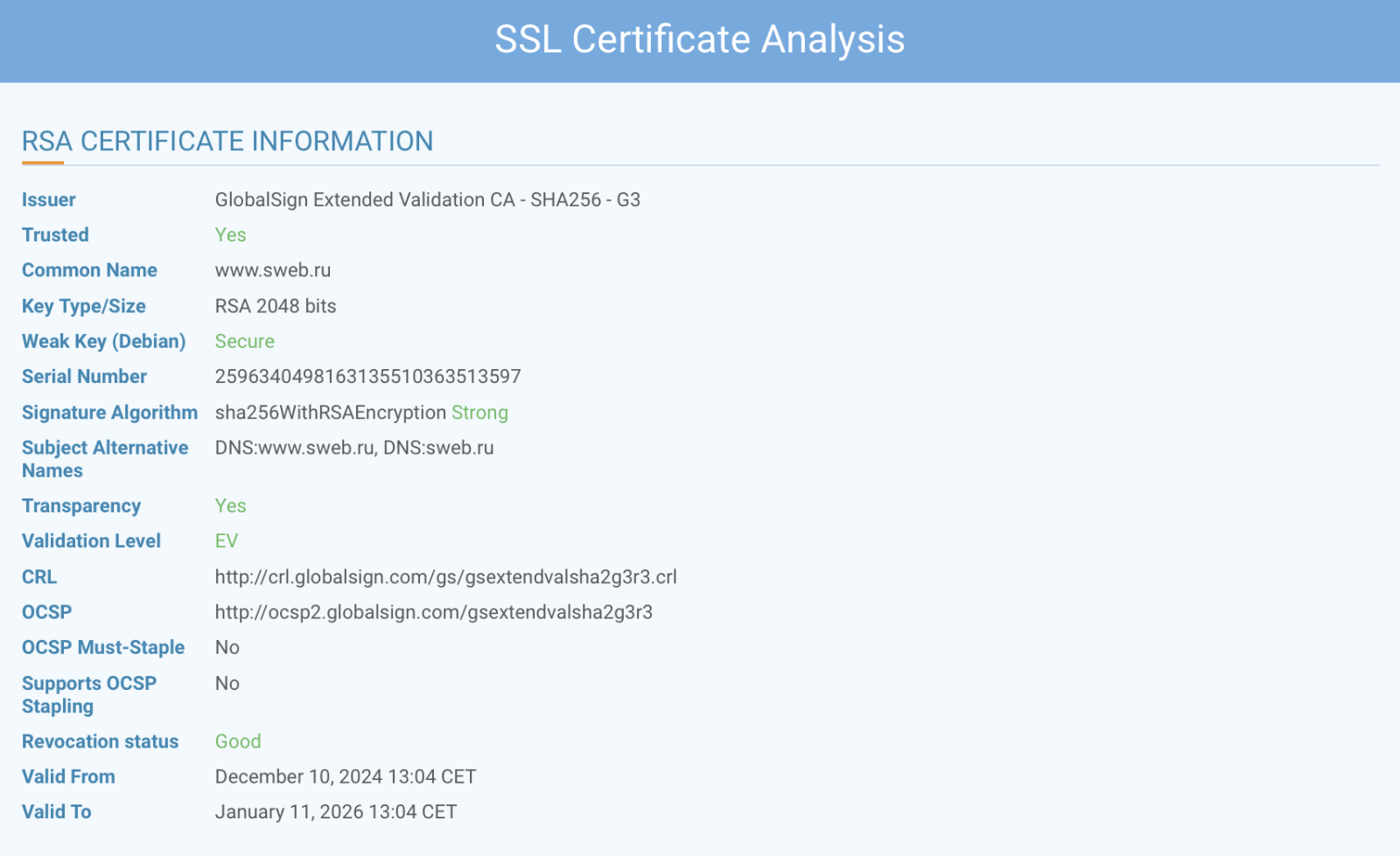 Более продвинутый вариант от одного из лидирующих Центров Сертификации. Помимо стандартных полей (серийный номер, издатель, срок действия), сервис показывает: