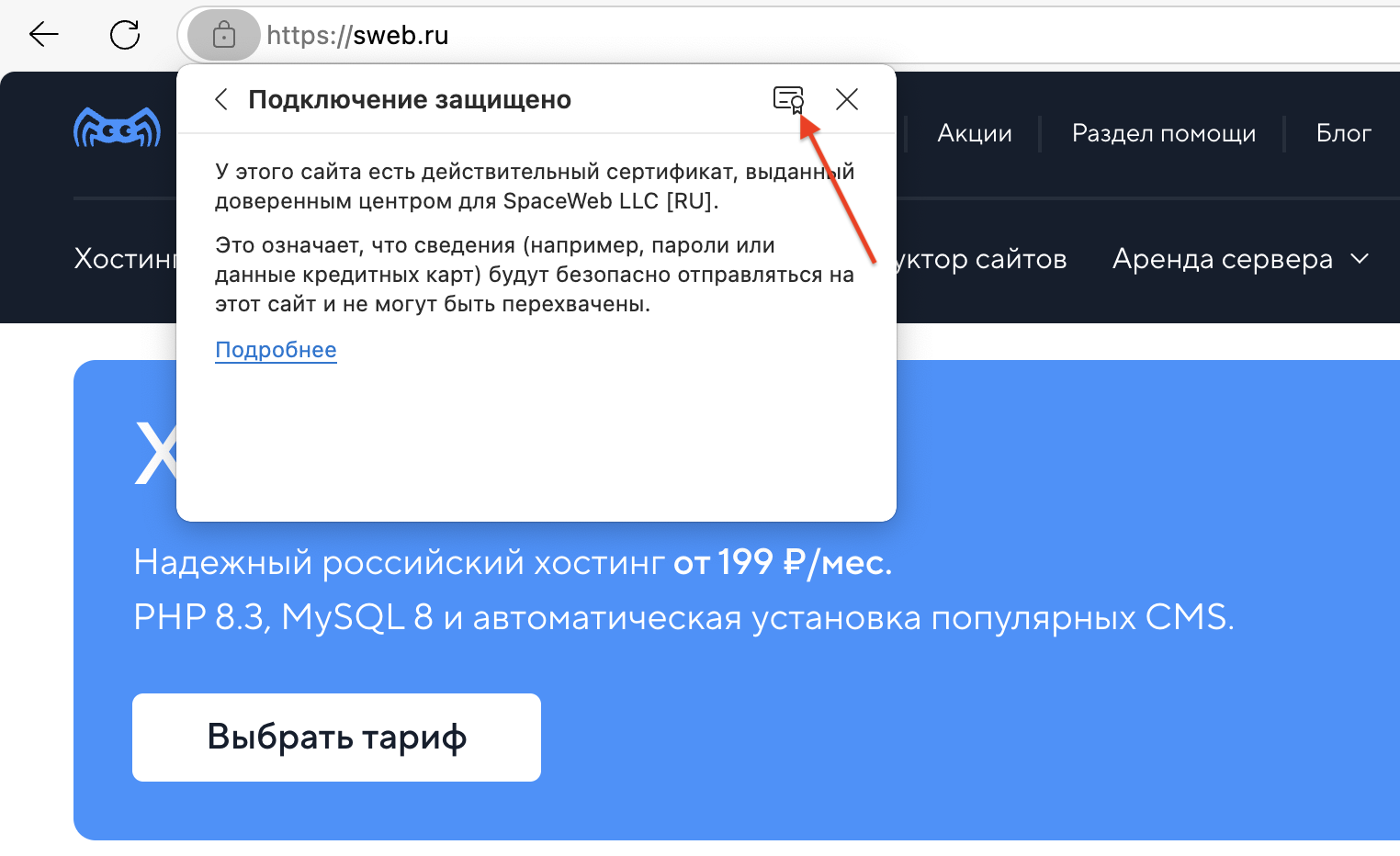 - Кликните по значку сертификата в правом углу выпадающего окна.