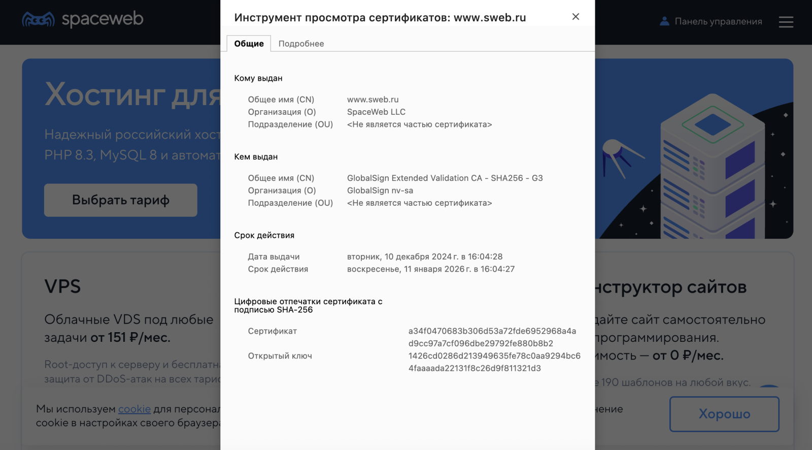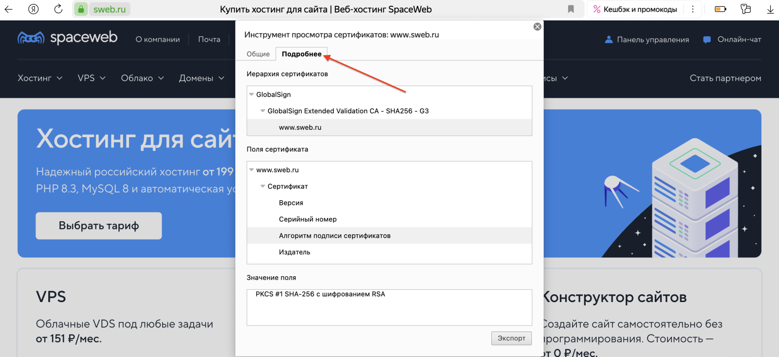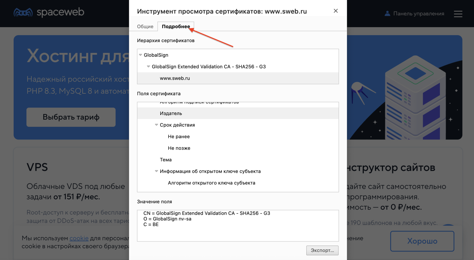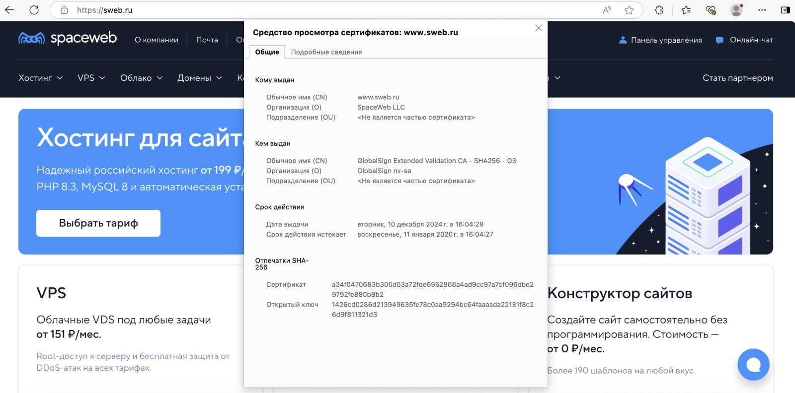 - Ознакомьтесь с подробной информацией о сертификате: кто и где его выдал, какие алгоритмы шифрования используются, какие сроки действия и так далее.