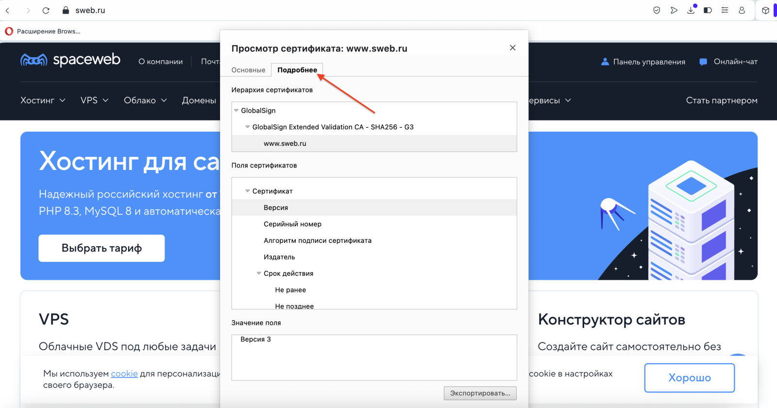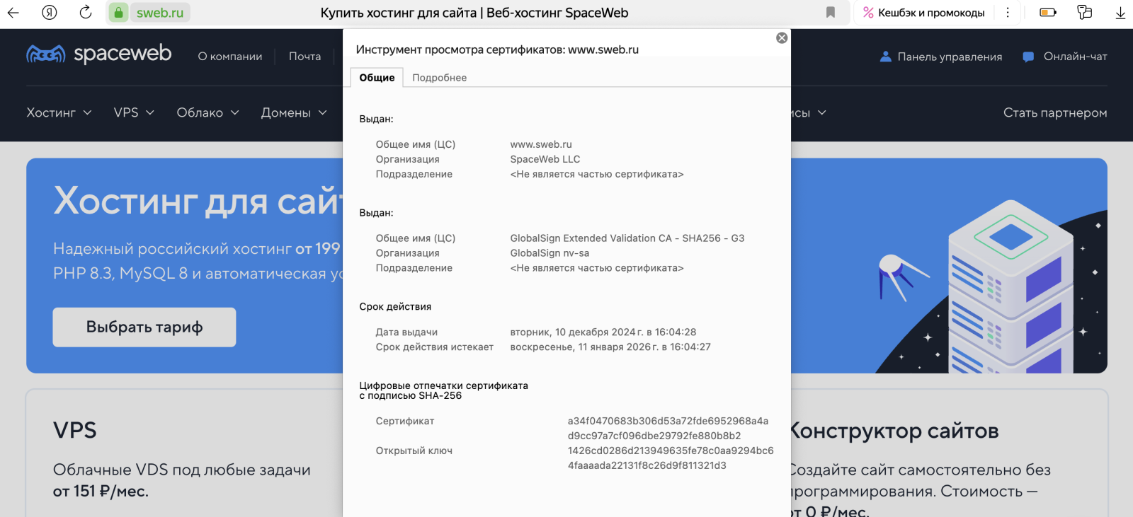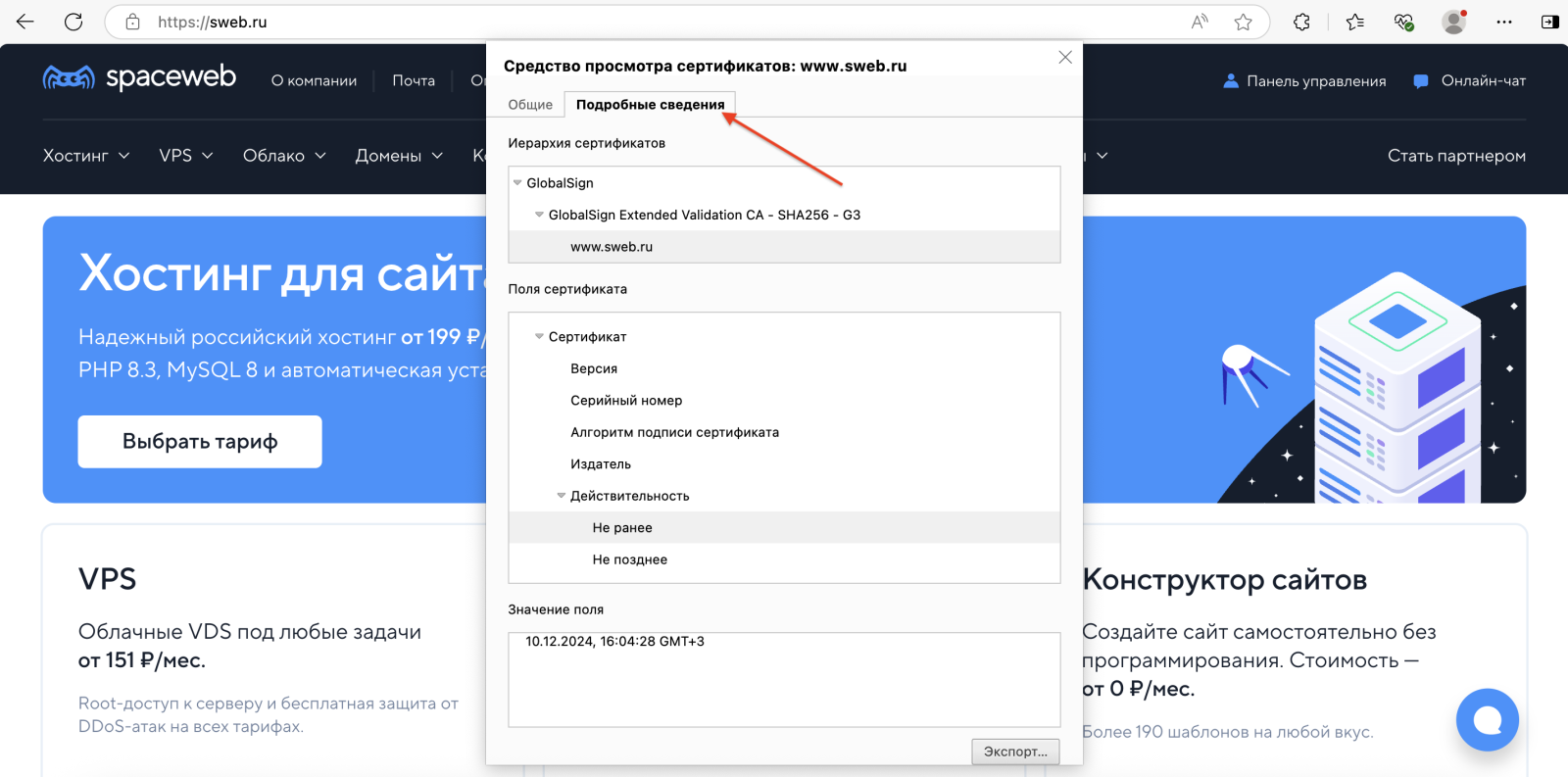 - Ознакомьтесь с подробной информацией о сертификате: кто и где его выдал, какие алгоритмы шифрования используются, какие сроки действия и так далее.