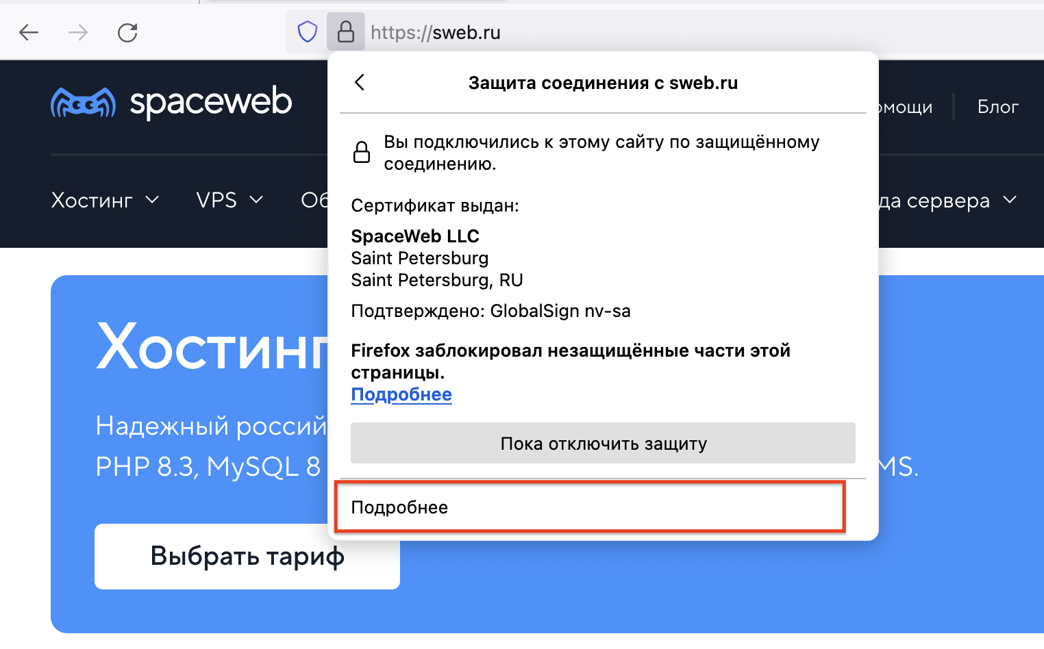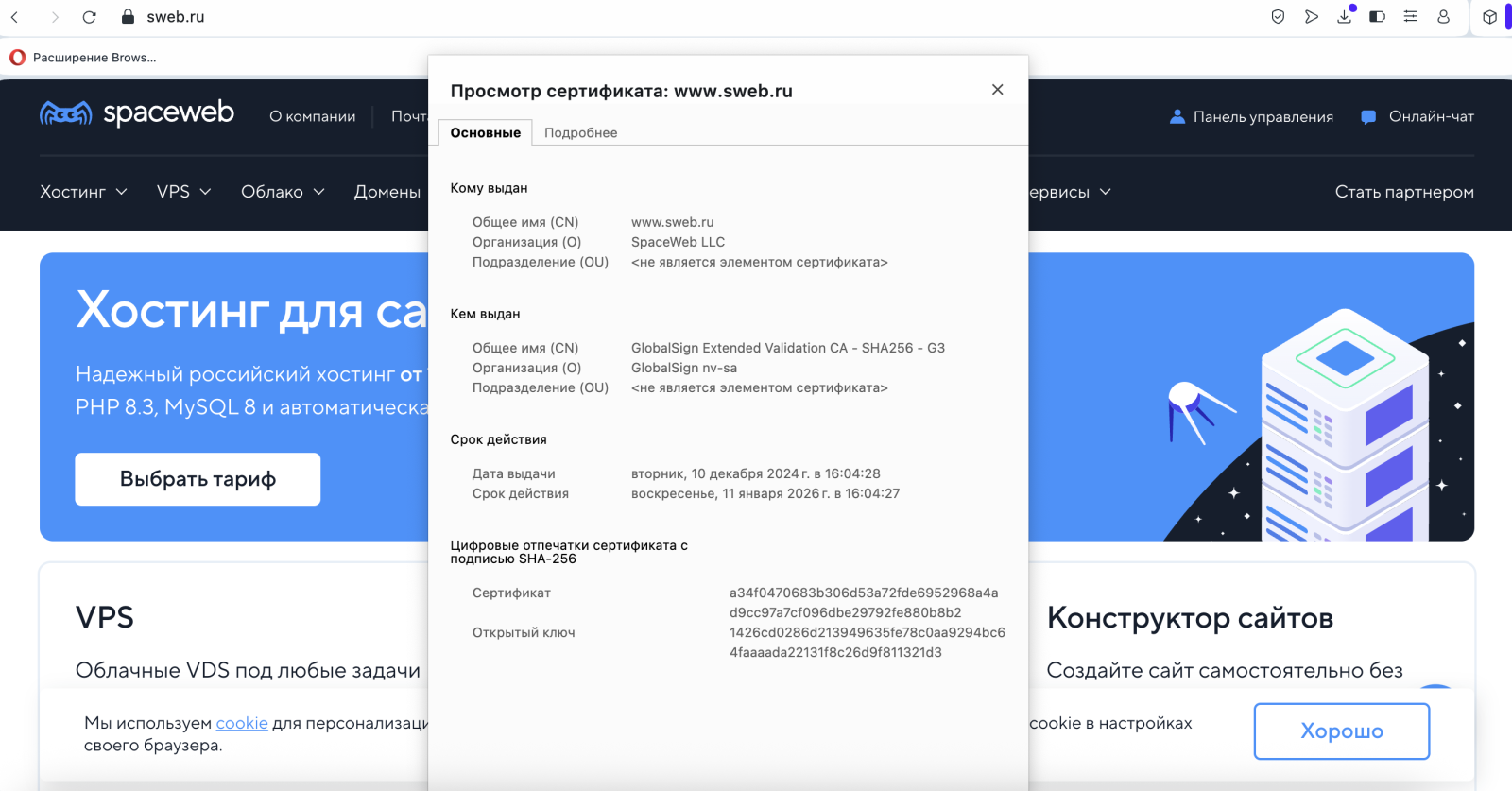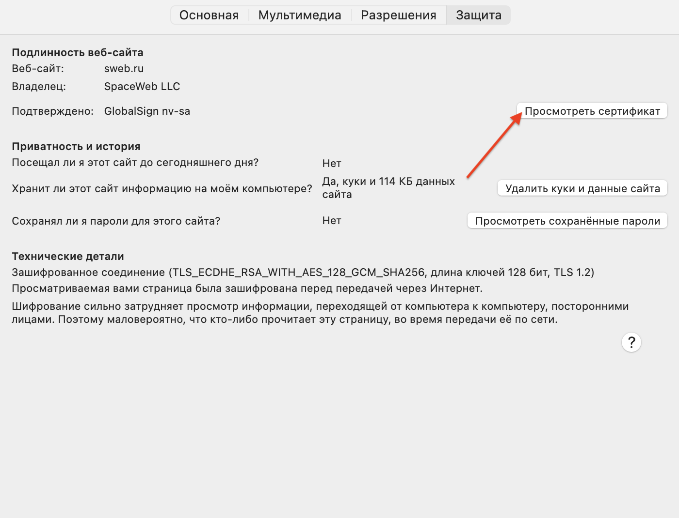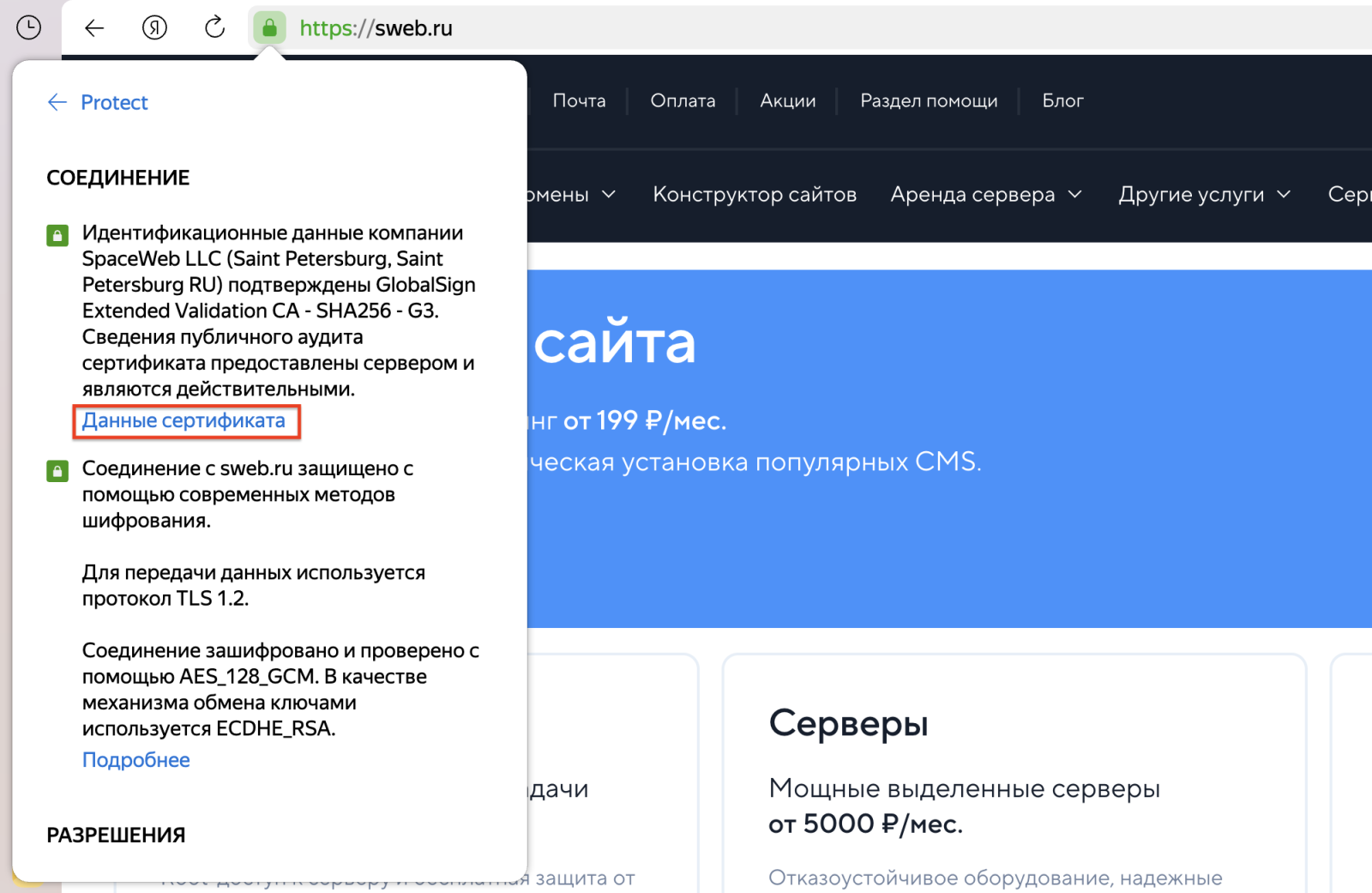 - Ознакомьтесь с подробной информацией о сертификате: кто и где его выдал, какие алгоритмы шифрования используются, какие сроки действия и так далее.