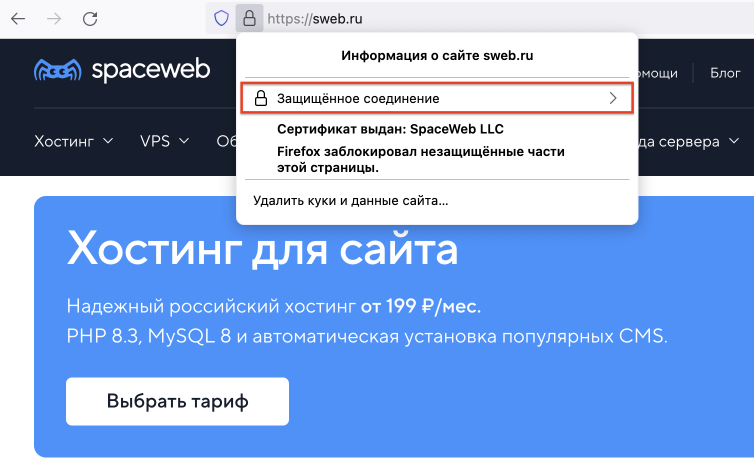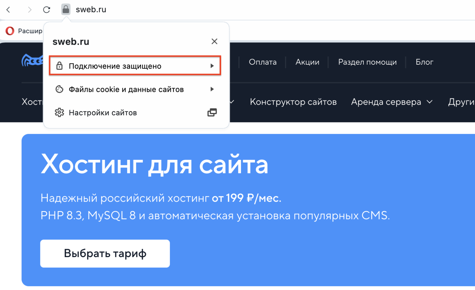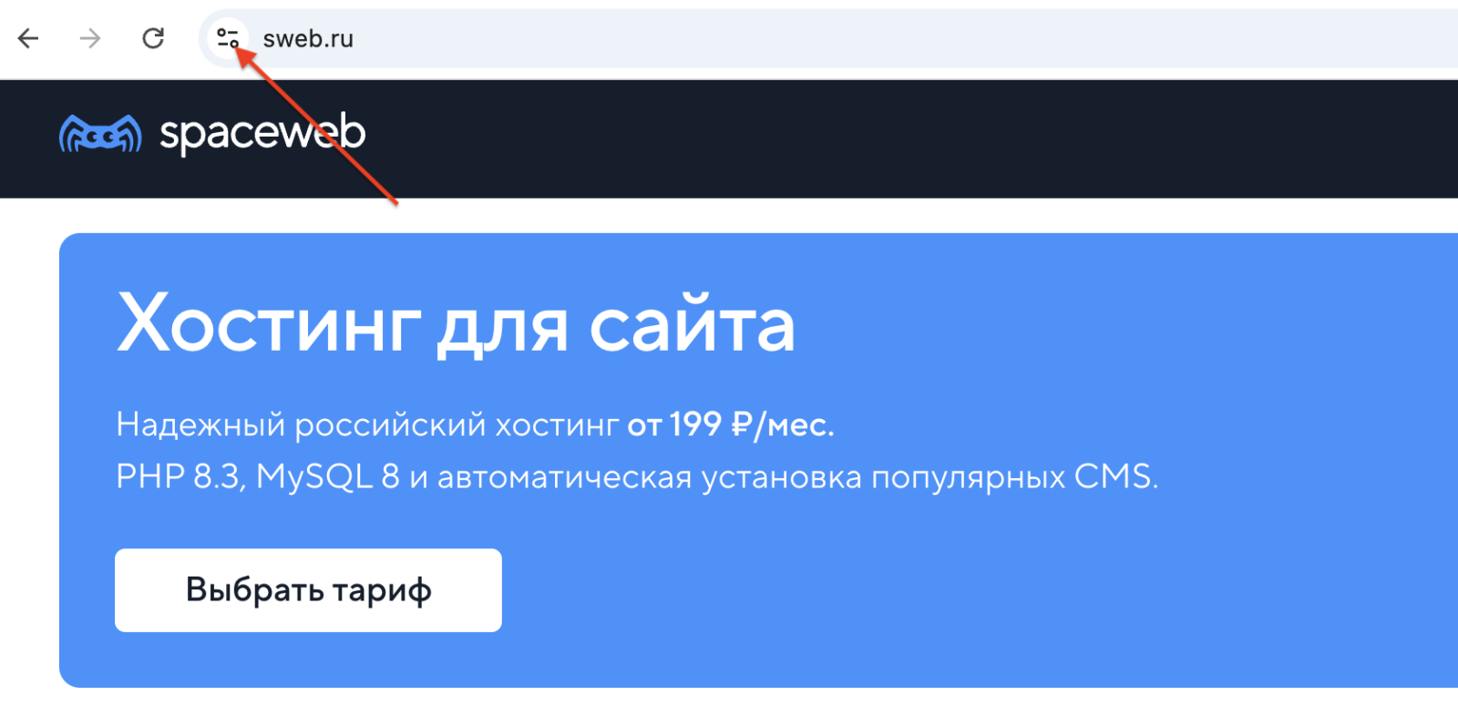 - Откройте сайт и кликните на значок замка слева от адреса.