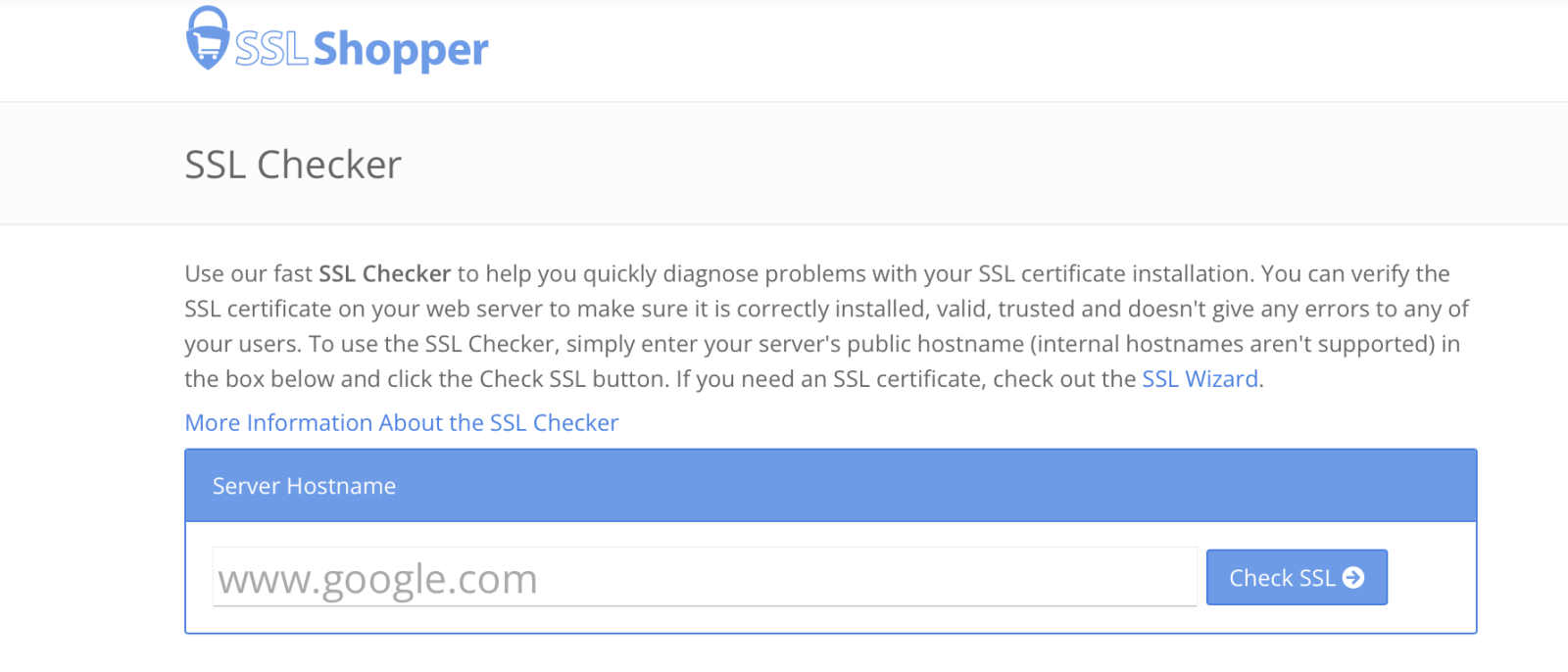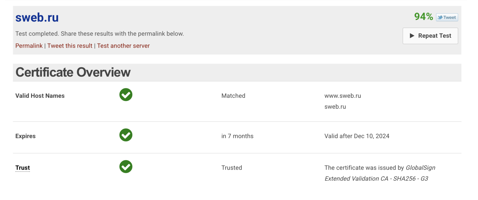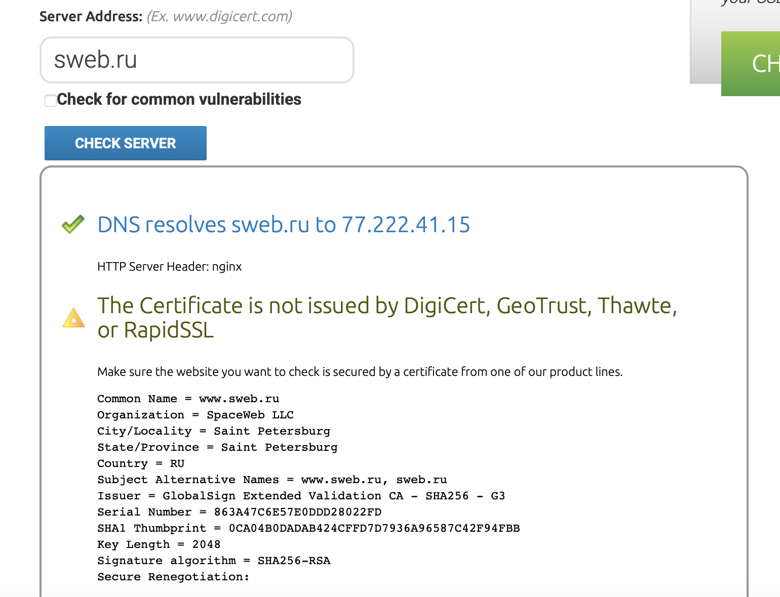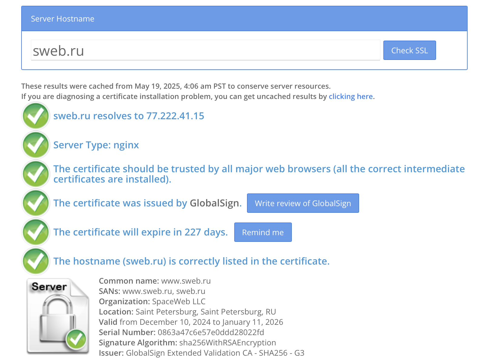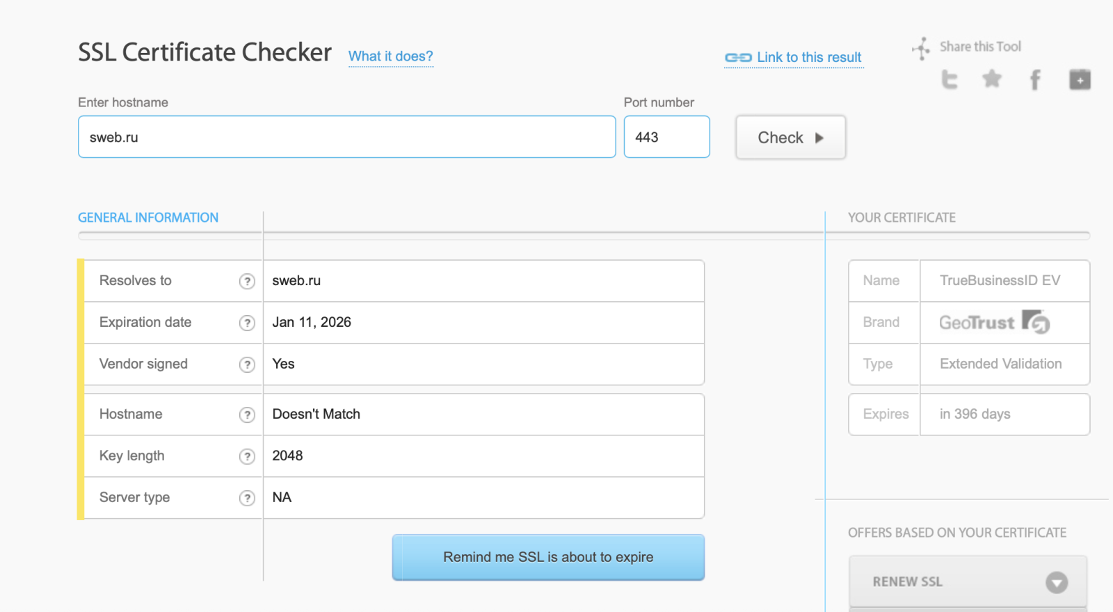 Простой и наглядный сервис, который показывает основную информацию о сертификате. Введите адрес сайта, и вы получите общие данные о SSL. SSLShopper предоставляет их в виде структурированного отчета: