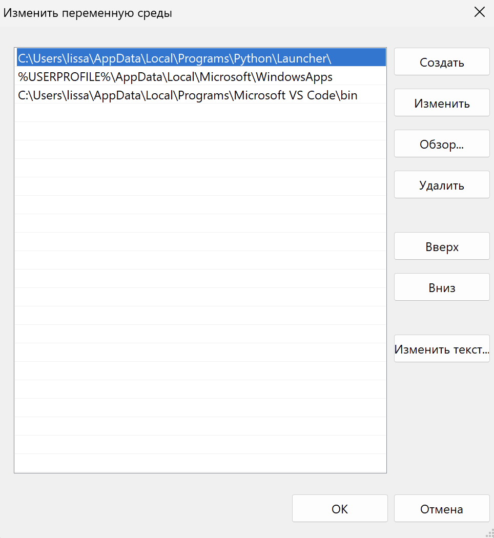 Если во время установки Python вы не отметили параметр «Добавить в PATH (доступно после перезагрузки)», интерпретатор не будет доступен из командной строки. В этом случае путь до него можно добавить вручную: