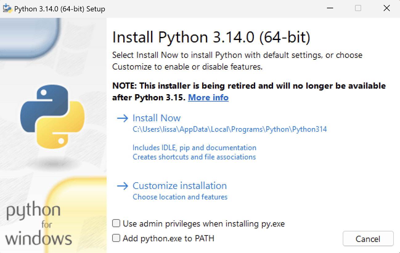 Install Now — полная установка, которая включает файлы документации, менеджер пакетов pip, библиотеку tcl/tk для графического интерфейса и стандартные библиотеки;