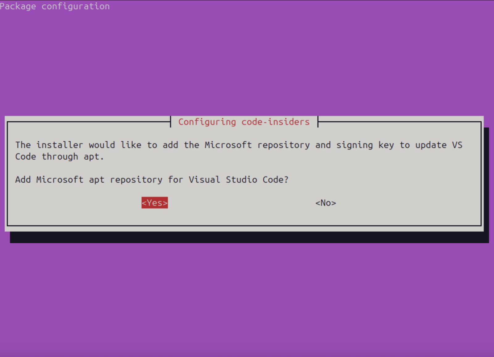 В процессе установки появится сообщение с предложением добавить репозитории Microsoft. Выберите Yes и нажмите Enter.