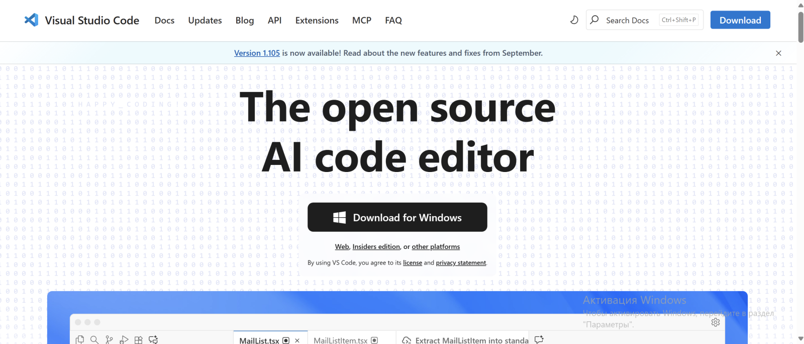- Перейдите на официальный сайт Visual Studio Code и нажмите кнопку «Download for Windows», чтобы скачать установочный файл.