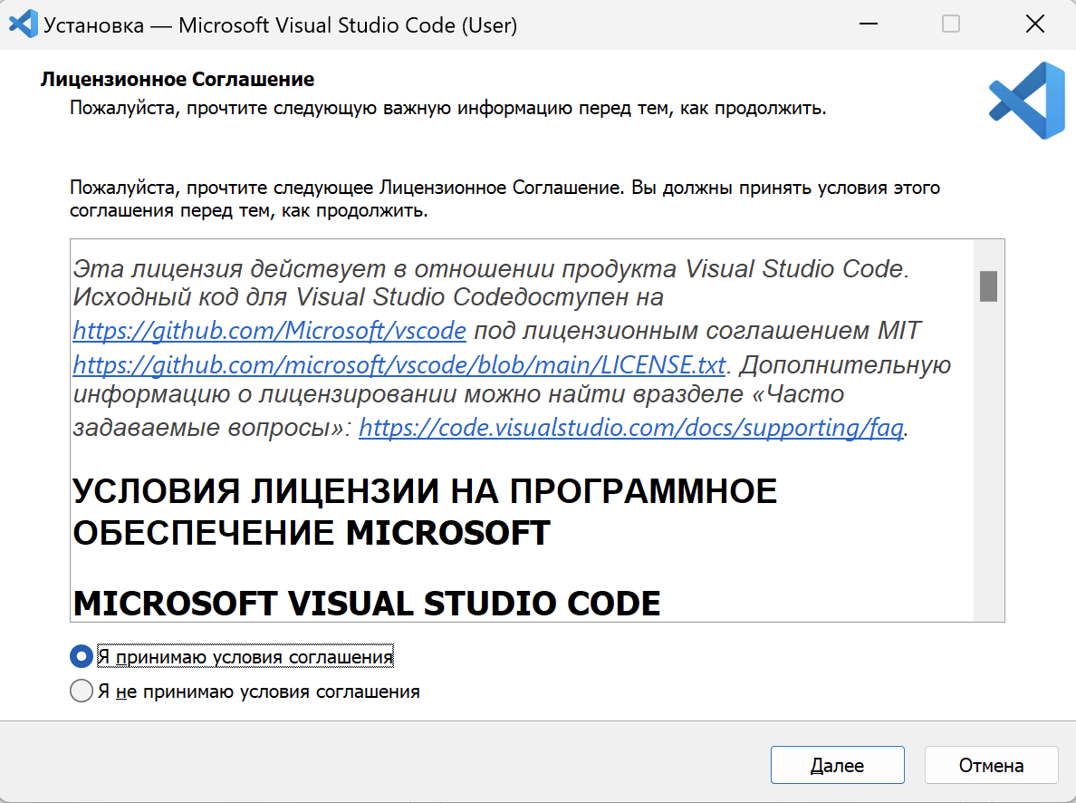 - В первом окне установщика примите лицензионное соглашение, выбрав пункт «Я принимаю условия соглашения», и нажмите «Далее».