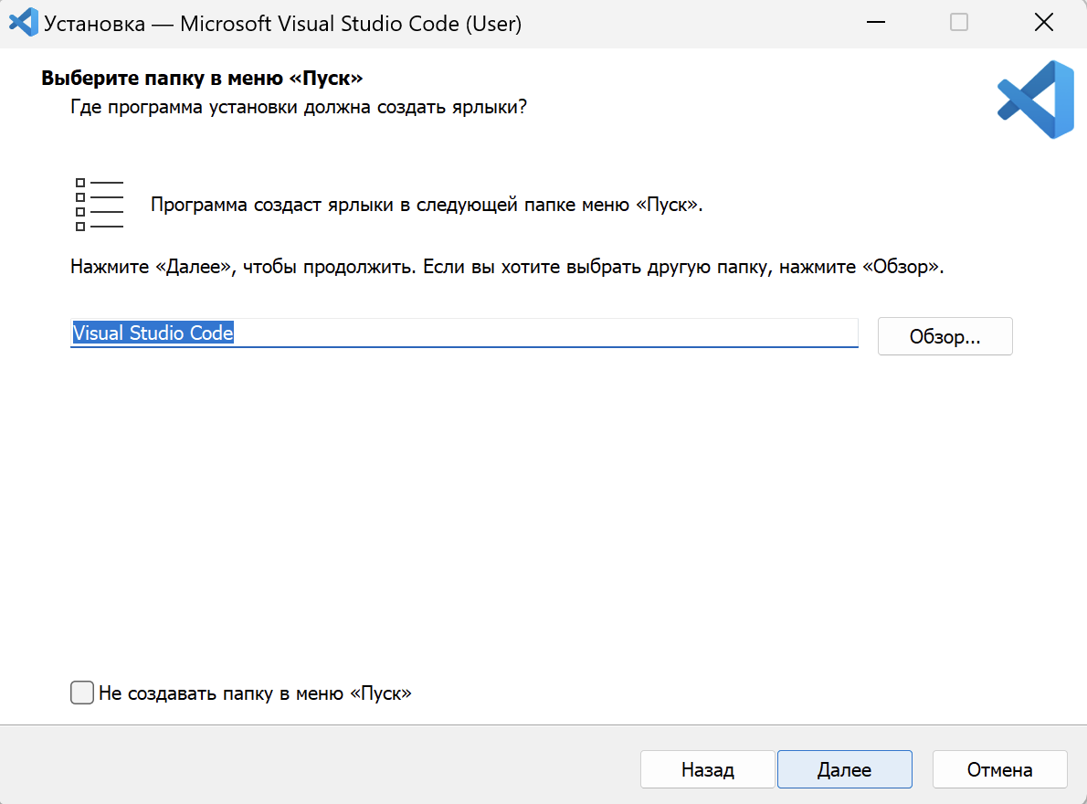 - На следующем шаге можно создать ярлык в меню «Пуск». Если ярлык не требуется, выберите «Не создавать папку в меню «Пуск»».