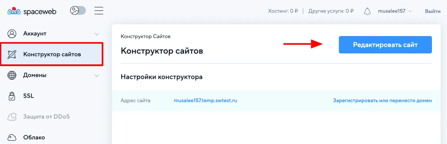 - Перейдите в Панели управления Spaceweb в раздел Конструктор сайта и нажмите Редактировать сайт