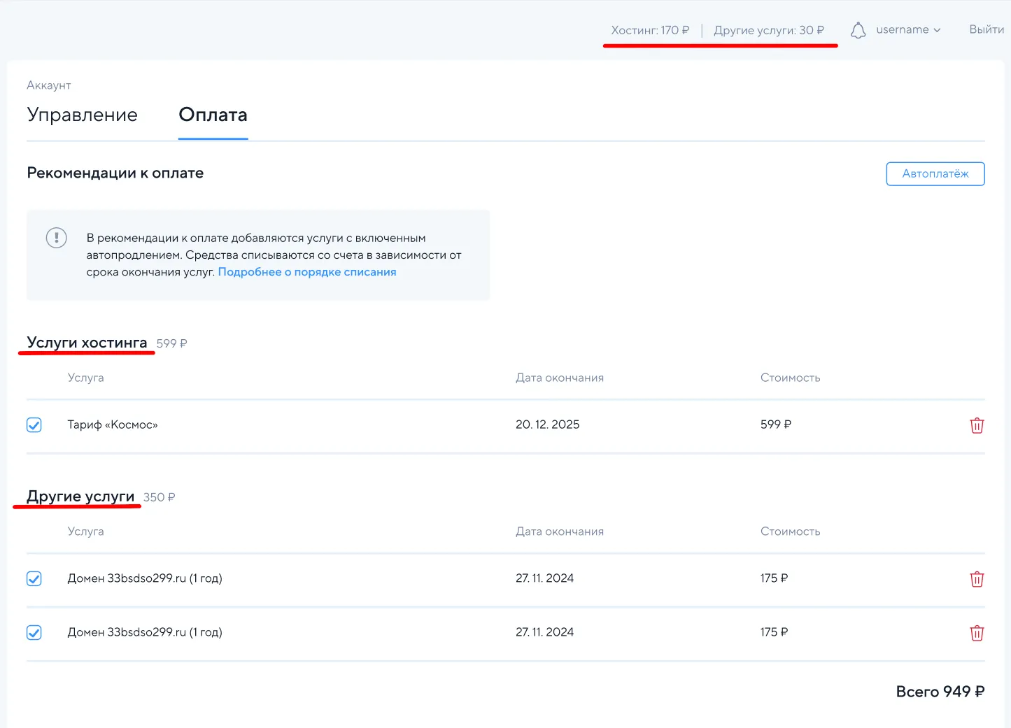 - Рекомендации к оплате не учитывают текущий баланс аккаунта "Хостинг", если установлен тип автопродления хостинга 1 год. И сообщают полную стоимость услуг для корректной продления услуги и зачисления бонусов по акциям.