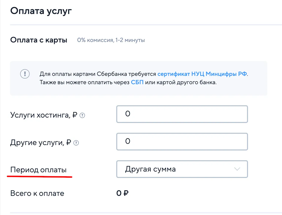 - на странице оплаты, в поле "Период оплаты" из выпадающего списка выберите "Другие услуги"