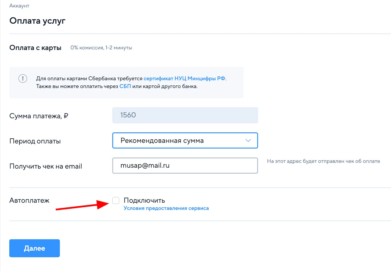 - Заполните сумму, email и проставьте галочку Подключить в поле Автоплатеж.