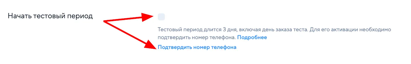 - Подтвердить номер телефона и подключить тестовый период, проставив галочку на странице заказа